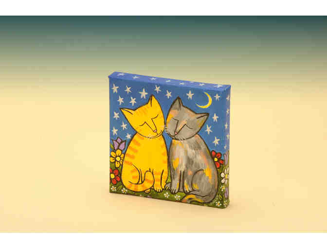 Two cats, PK and Nellie, relax under the stars in this whimiscal scene by artist Jen Niles. Jen is a self-taught artist who lives and works in Paxton, Mass. In 2001 she began experimenting with acrylics, inspired by the comical antics and effortless elegance of my her cats, PK and Nellie.