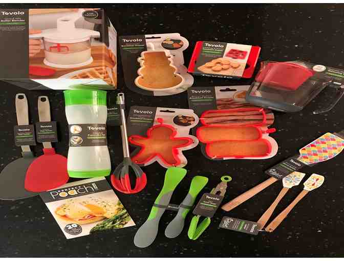 Make breakfast better with these fun and whimsical kitchen tools. Package includes Quick Mix Batter Blender, Snowman and Gingerbread Man Breakfast Shaper, 2 Flex Turners, Pancake Pen, Batter Tool, Bacon Stuffed Breakfast Shaper, Magnetic Nesting Measuring Cups, Ladybug and Flower Sandwich Maker, Perfect Poach, Mini Turner Tongs, Silicone Spatula, Mini Spoonulas