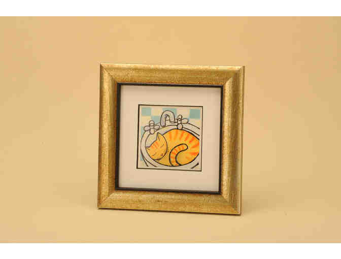 Cats curl up in the darndest places! This adorable drawing of a cat in the sink is framed and matted (not with fur, with paper silly!) and protected by museum glass.