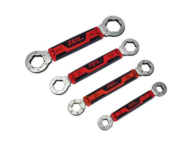 Donated by Martin's Hardware in Bristol, VT. The SKIL Secure Grip wrenches feature patented self-adjustable inserts that are able to grip rounded off bolts which can't be gripped with traditional wrenches or sockets. These steel teeth 'bite' into the bolt as you turn, creating effortless loosening or powerful tightening.