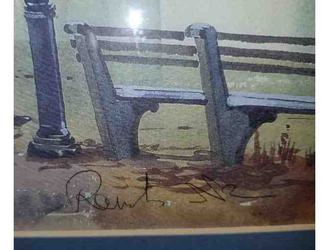Beautifully serene image of a woman sitting on a park bench by the water with the city landscape in the background. The painting is signed "Roberts Jr." in the lower right corner.