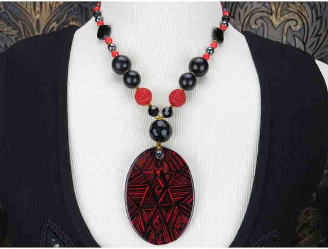 POWERFUL Necklace features Porcelain Art Pendant, Coral, Cinnabar, Hematite, Onyx!! 1/Kind