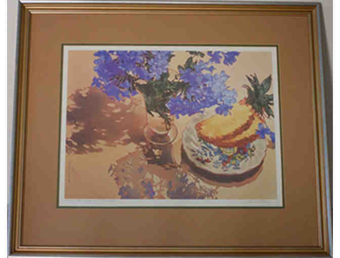 “Plumbago & Pineapple” by Kim Starr, 1989. #255 of 500 prints. Image approx.. 22 ¾ ” x 16 ¾”. Framed image approx.. 34 ½” x 29 ½”.