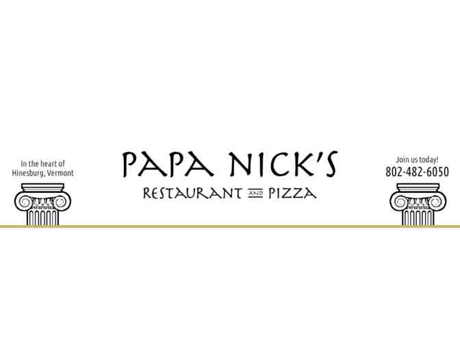 Come to Papa Nick's for a large, one topping pizza when you win this auction - and enjoy this favorite place to gather and eat great food! Papa Nick's is a family owned and operated restaurant since 1990 serving comfort food at its best. Homemade Cinnamon Swirl French Toast, Fresh Roasted Hot Turkey Sandwich, Broiled Salmon, New York Strip Steak and multiple Pizza creations. We have a full bar with an extensive beer and wine list. Come in for friendly service or call for take-out. We look forward to seeing you soon.