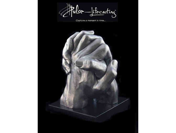 Professional three-dimensional lifecasting of a pair of hands--actual size. It can be a pair of one person's hands, or one hand from each of two people. Includes casting session and final sculpture made in casting stone with finish of your choice, mounted on a black-wood base. Please check the website for creative ideas and more details about these unique and artistic creations.