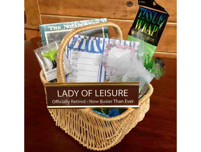 A basket of note pads, decorative paper plates, dessert wine, journal, tissue paper and an audio splitter. Wrapped up in clear cello and topped with a bow for gifting. Lady of Leisure plaque also included.