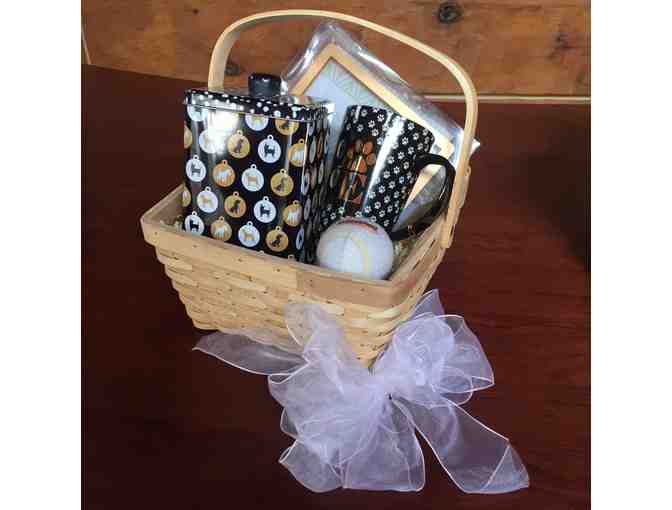 Beautiful gold and black design for a covered treat tin, ceramic coffee mug, gold frame and of course a ball for your dog. Basket is wrapped in clear cello and topped with a bow for easy gift giving!