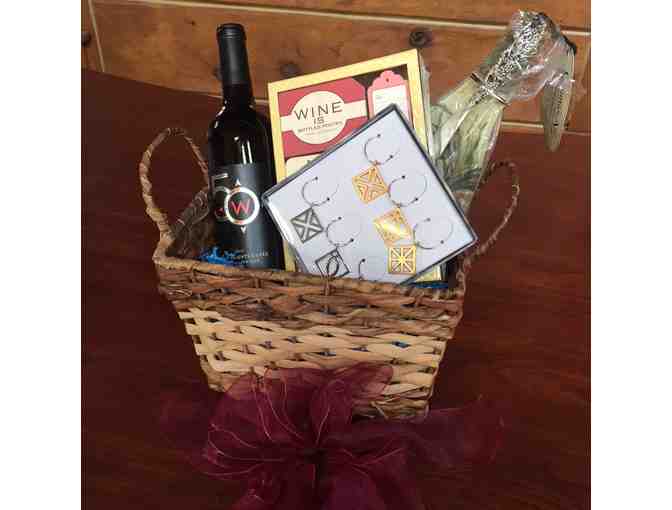 For yourself, for a friend, or the perfect hostess gift! Basket includes a bottle of red wine, 6 wine charms, marble cheese server with cheese knife, and wine themed gift tags. Wrapped up in clear cello and topped with a bow for easy gift giving!