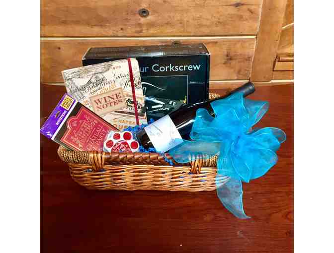 Perfect hostess gift or a gift to yourself! A bottle of Pinot Noir, deluxe corkscrew with accessories, wine tasting invitiations, wine journal and a mini cheese tray. Wrapped in clear cello and topped with a bow!