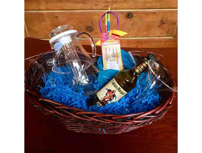 Captain Morgan spiced rum, pina coloda mix, 4 glasses and a pitcher. Makes a great hostess gift! Basket is wrapped in clear cello and topped with a bow - ready for gift giving!
