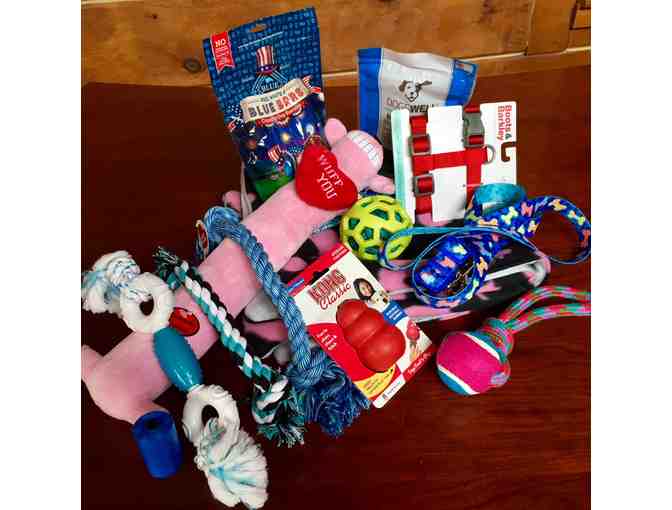 Everything for your pup and then some. Toys, collar, leash, harness, and a crate blanket. Wrapped in clear basket wrap and topped with a bow for gift giving.