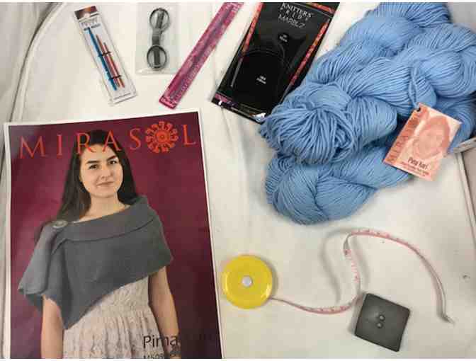 Knit This, Purl That! ....your Knitting place! Your friends at Knit This, Purl That! have compiled a lovely Knitting Basket full of goodies that includes: Pattern for Garter Stitch wrap, 3 Skeins of Mirasol Pima Kuri Yarn, US Size 6 Circular Needles, 3 Pack Darning Needles, Square Pewter Button, Size G Crochet Hook, and a pair of Folding Scissors.