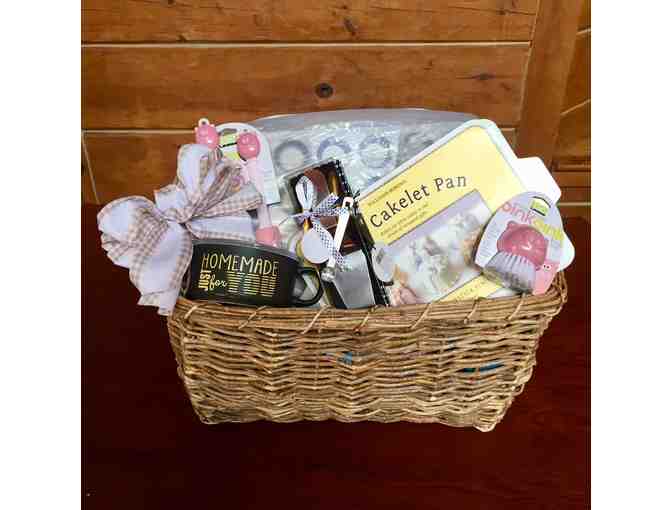 This useful and whimsical basket includes a Wilton 6 in 1 ultimate bake and carry set, measuring spoons, cake/pie serving piece, silicone mini spatulas, kitchen scrubber, Williams Sonoma "gift cakelet pan", ceramic soup mug with lid and a kitchen towel. Displayed in the basket shown, wrapped in clear cello and topped with a bow!