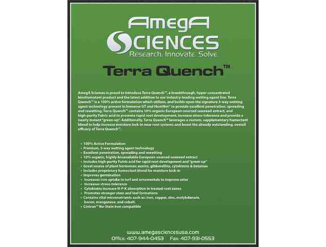 AmegA Sciences is proud to introduce Terra Quench™, a breakthrough, ultra-concentrated biostiumulant product and the latest addition to our industry-leading wetting agent line. Terra Quench™ is a 100% active formulation which utilizes, and builds upon the signature 3-way wetting agent technology present in Immerse GT and HumWet® to provide excellent penetration, spreading and rewetting. Terra Quench™ contains 10% organic European-sourced seaweed extract, and high-purity Fulvic acid to promote rapid root development, increase stress-tolerance and provide a nearly instant “green-up”. Additionally, Terra Quench™ leverages a custom, supplementary humectant blend to help increase moisture lock-in near root systems and boost the already outstanding, overall efficacy of Terra Quench™.