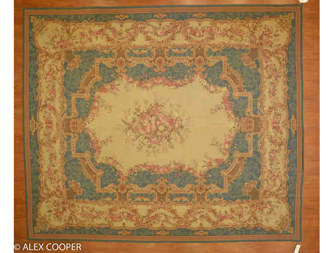 This is a custom needlepoint, hand-stitched, rug made in China, with all wool face. Rug size is 10' 9" X 12' 7".