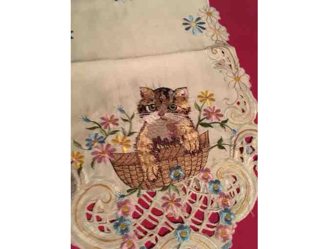 This is just a lovely item for any cat lover's table! You are viewing half of it, placed accross my square card table for size. Who can resist this darling kitten surrounded by Spring pastels? Donated by AJ VAnder Ende.