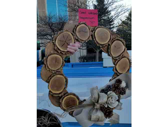 This is a beautiful wreath for your home year round or a Christmas welcome in winter. The slices of wood are stunning and pine cones are the real deal. This wreath is handmade and should be kept in areas where temperatures do not exceed 75* because of the glue that holds it together.