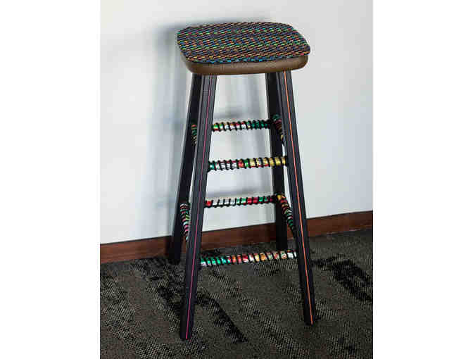 A fun and colorful piece to add extra seating, serve as a plant stand, or brighten up a corner of the room. This creative piece has painted rubber matting on top with brightly-colored foil and black twine on the cross bars. It stands 29" high with the top measuring 12" square. This recycled wooden stool is from the imaginative mind and steady hand of local artist Joel Cohen.