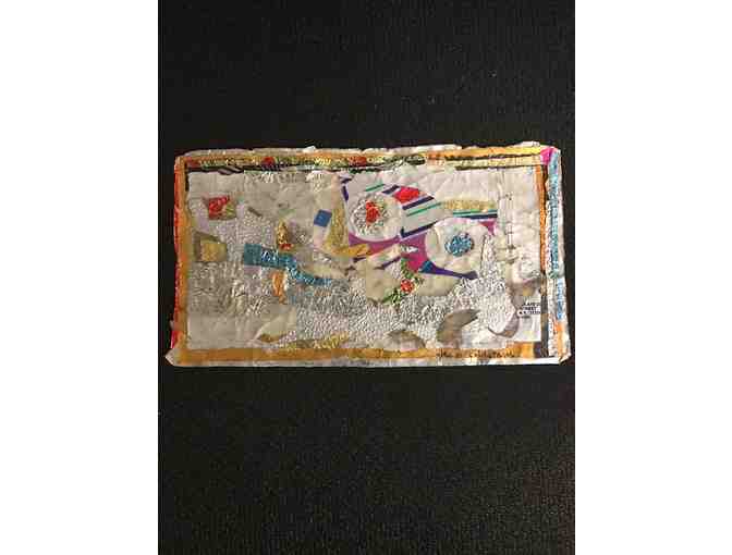 You are bidding on a small, rectangular, approximately 3-1/4" X 6", unframed collage with prominent silver tones and brilliant touches of color made from candy wrappers. Gladys Hack Goldstein (1918 -2010) was an abstract painter inspired by nature, who used light, layers, and glorious shapes to convey what was always bursting to be expressed. Mrs. Goldstein studied in Mexico, Santa Fe, and many other places, but she was born, lived most of her life, and produced her largest body of work in Baltimore. She spent her whole life drawing, painting, making paper, creating mixographias and collages, and sculpting because it was her life's calling--it was in her DNA. Her work is in many public and private collections throughout the United States and Europe. The University of Maryland University College exhibition in 2004, "Capturing the Essence: The Art of Gladys Goldstein," celebrated the opening of the Gladys Goldstein Gallery in the UMUC Inn and Conference Center. This gallery is the university's first permanent display of contemporary abstract art.