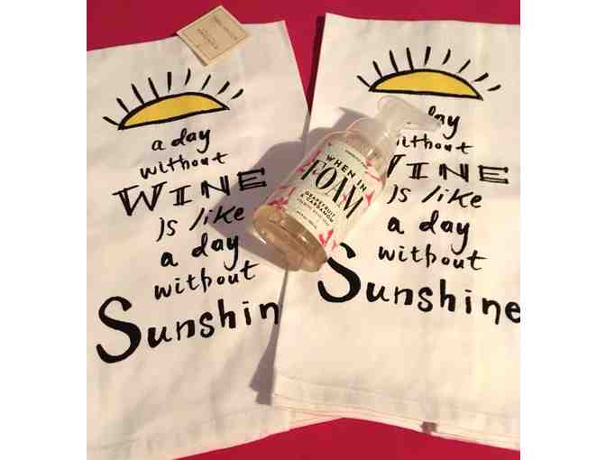 Spuce up your kitchen with some bright, cheery dish towels and a Grapefruit and Cardamon scented foaming hand soap. This gift was put together for you by Susan Hergert and AJ Vander Ende.