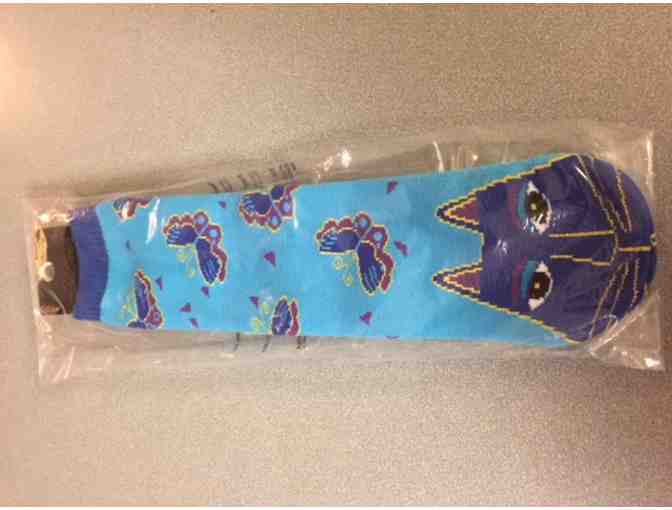 Step into a world of bold color and whimsical design with these vibrant cat and butterfly socks rendered by beloved artist Laurel Burch.
