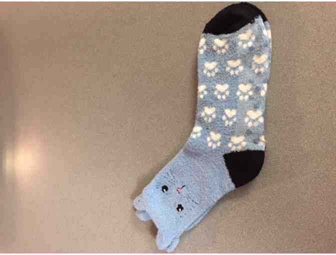 Perky ears and adorable whiskered smiles, these super soft socks are a sweet treat for your feet! Patterned with white paw prints and completed with grips along the soles for non-slip comfort.