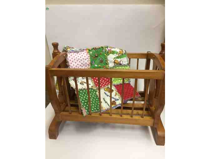 A maple baby doll crib with handmade baby quilt, 24" by 28".