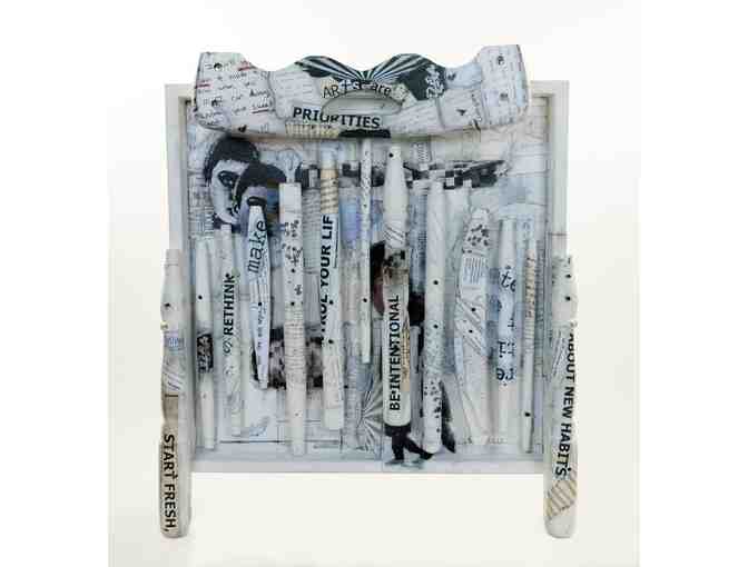 Take A Seat is an assemblage collage created by Karla Leopold that reveals the multi-faceted talent, passions, and emotions of students attending Idyllwild Arts Academy.  With the objective of capturing the hidden essence of teenage life and their journey towards building a better sense of self, the artist offers a glimpse of the day and life of teenagers through writings and words collected over time.