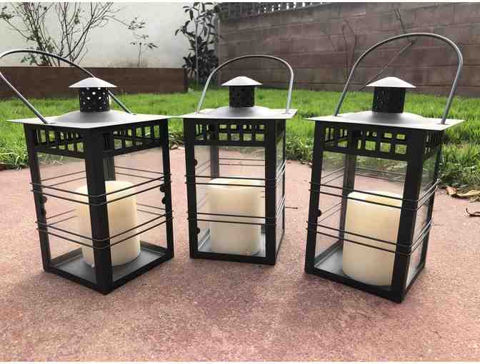 Add charm to your patio space with these 3 Glass Lanterns with Black Frame This modern glass candleholder is shaped like an old-fashioned lantern to add a touch of character to any space. Made with glass and steel, this modern lantern features an updated black frame that's powder-coated for a high-quality, durable finish. The vented top and handle add contemporary accents to the piece, making it a perfect complement to a variety of decorating themes. Pillar candles included. Dimensions (Overall): 10.0 inches (H) x 4.75 inches (W) x 4.75 inches (D)