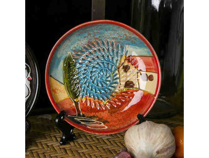 Hand-painted Spanish pottery, including a large bowl, small grater dish, garlic keeper, garlic peeler, brush, display stand, and an assortment of gourmet Spanish foods (olive oil, spices, and more)