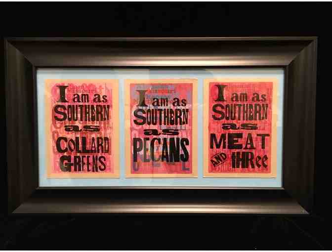 A framed trio of original prints including "I am as Southern as Collard Greens," "I am as Southern as Pecans," and "I am as Southern as Meat and Three. Letterpress prints by Amos Kennedy, a Metropolitan Museum of Art featured artist!