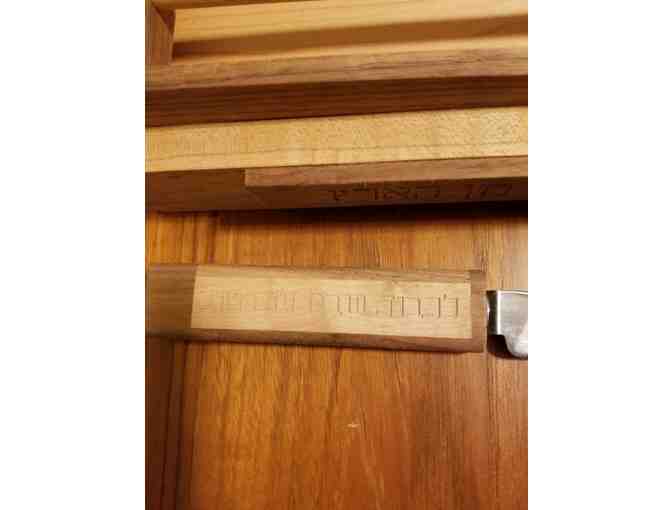 Both the knife and the cutting board are engraved with Shabbat inscriptions.