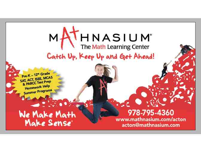Certificate includes Evaluation, Registration fee and five hours of tutoring at Mathnasium in Acton. Must be used by a first time student from a new family (not a sibling of existing student).