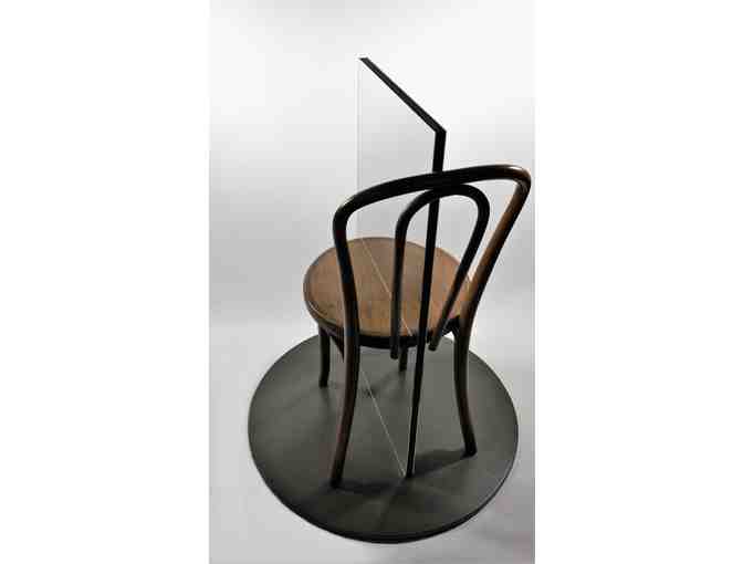 A chair is often seen as a symbol of power, in this piece the cut chair represents partisan political power; and its reflections politicized constructs-fake news, propaganda, conspiracy theories. From the perspective of each chair, the reflection appears to be the other chair, but in reality, they are looking at themselves.
