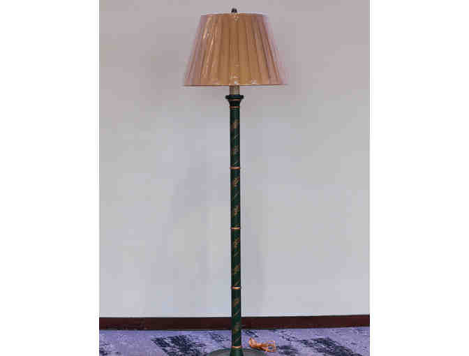 A green gold English style floor lamp with honey-colored box-pleated shade. Lamp stands 68" high with 20" diameter shade. From a huge custom home to an intimate study that requires a perfect lamp, every lighting detail is important. For over 45 years, Jones Lighting Specialists, located on Falls Road, has been at the forefront of lighting design.