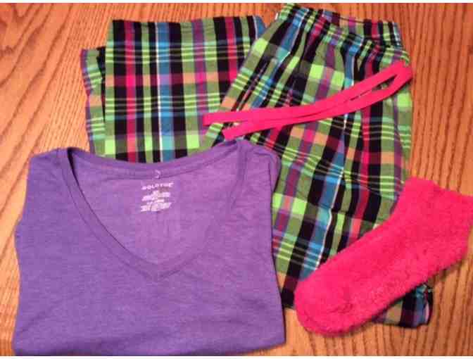 Colorful Cool comfort lounge pants by Boxercraft - Women's size Medium. 3.6 oz. 100% cotton sheeting. Covered elastic waistband with adjustable satin drawstring closure and side pockets. Coordinating Gold Toe short sleeve T-shirt and a pair of Dr. Scholl’s slipper socks.
