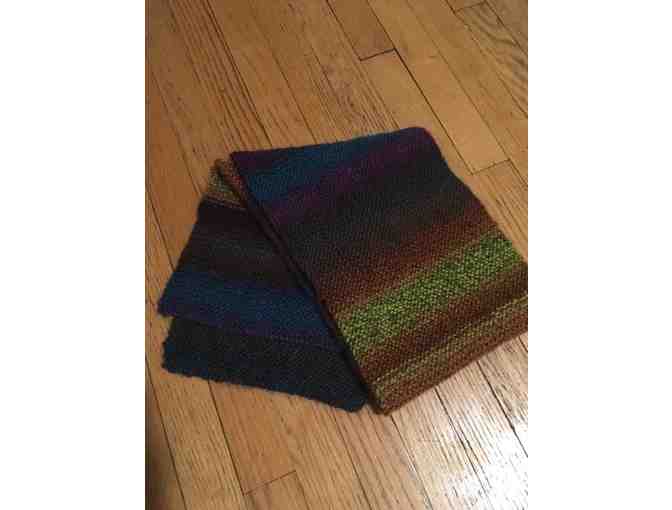 Silky, cozy style is this hand knit multicolor scarf in Fall colors in blues, greens, and browns.