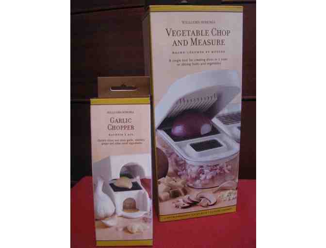 Two extremely handy kitchen tools! Williams-Sonoma Garlic Choper which quickly slices and dices garlic, shallots, ginger and other small ingredients. And the Vegetable Chop and Measure which is a single tool for creating dices in 3 sizes or for slicing fruits and vegetables.