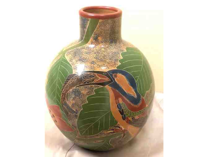 Beautiful hand crafted vase featuring a toucan and floral patterns - from the village of Masaya in the foothills of central Nicaragua.