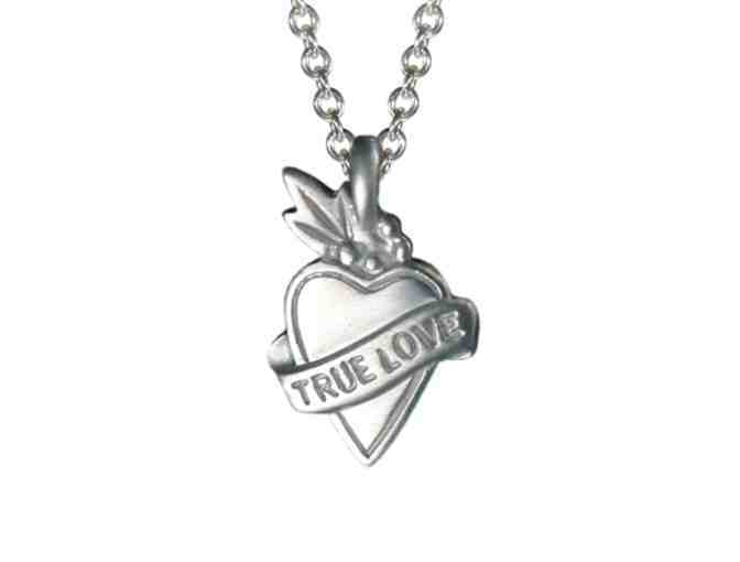 This sterling silver heart pendant is approximately 3/4 inch long by 7/16 inch wide. A true love banner is draped across the heart.