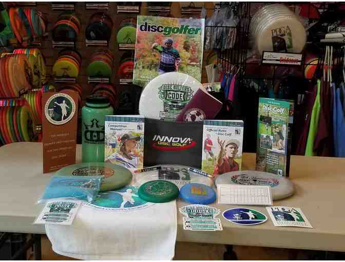This package will include everything needed for two people to enjoy a day on the disc golf course. Included in this package you will find: two mid-range golf discs, two putter golf discs, a starter disc golf bag, towel, water bottle, score book, DiscGolfer Magazine, and more!!