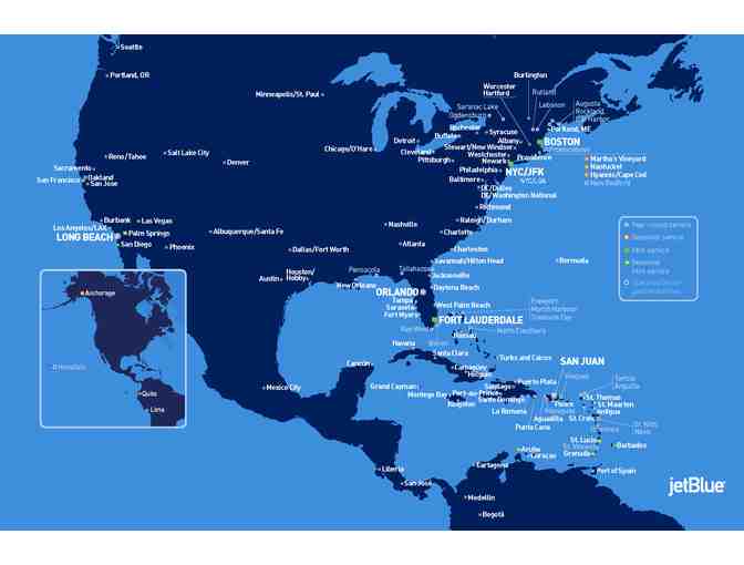 Two round-trip vouchers can be used for air travel to any location, domestic or international, served by JetBlue. So where does JetBlue fly? The question is, where doesn’t JetBlue fly? Choose from 101 destinations in North, South and Central America—from Alaska to Peru.