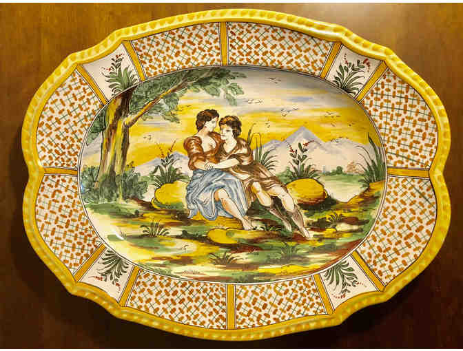 This beautiful serving platter features a romantic scene in a bucolic setting.