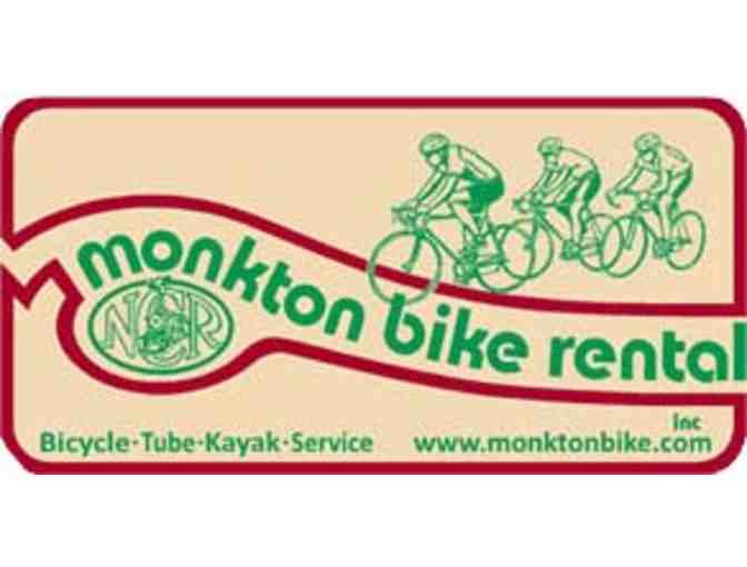 Fun for the family or just to cool off. Tubing for four people on the scenic Gunpowder River in Monkton. The tubes are deluxe, covered in canvas with heavy-duty handles for your comfort and safety. And although Monkton Bike no longer rents kayaks, until it's time for tubing, don't forget that bike rentals start in April for fun on the bike trails.