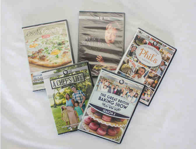 Five DVD productions including: Great British Baking Show Season 2; A Chef's Life Season Five; I'll Have What Phil's Having; Cook's Country Season 9; and Alice Waters and Her Delicious Revolution. Yum!