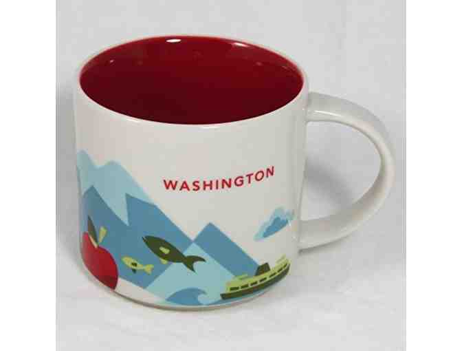 This Washington State Mug is part of the "You are Here Collection" and depicts such Washington state icons as the State Ferry, a Washington apple, salmon and Mt. Rainier. New and comes in the orginal gift box. 14 oz.
