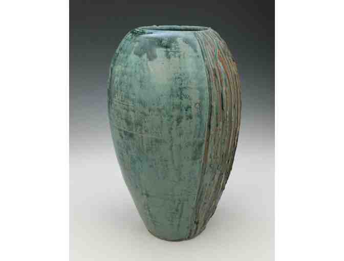 This beautiful, hand crafted vase will be your new favorite home accessory. Carved stoneware vase with green glaze, guaranteed to bring a pop of color to any rooms' decor. Height - 15in.
