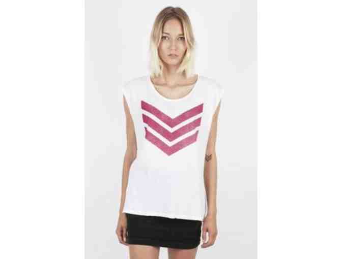 Effortlessly cool Hayden Logo tee by June 7.2 in white and red. Stonewashed muscle tee. Pigment color print logo on chest. Boxy fit. Size Medium.