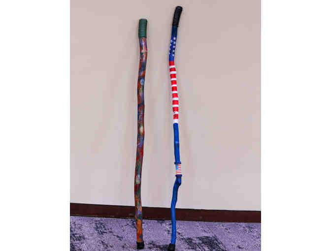 If you choose to "walk softly and carry a big stick" then this item is what you need. Two handpainted walking sticks perfect for spring strolls. The multi-colored one is 44" and the red, white, and blue is 48".