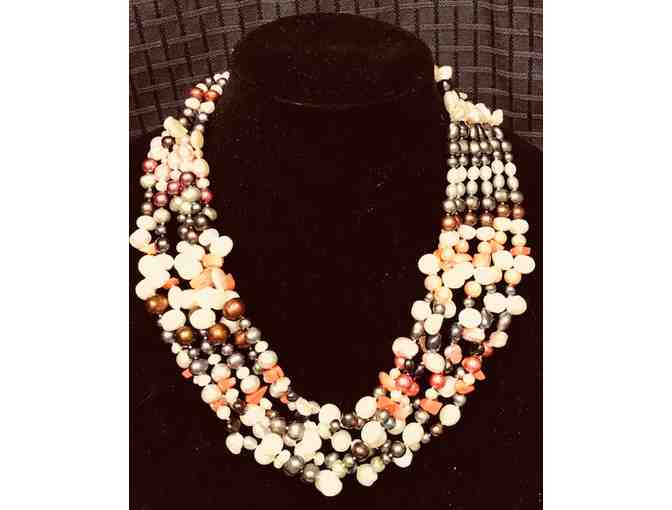 Stunning, multi-color, multi-strand fresh awter pearl & coral necklace approx. 22". Perfect statement piece for summer wear.